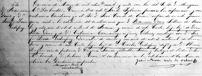 Le 5 mars 1867, âgé alors de 38 ans, Francesco Derro, fils de Juan Derro et de Catarina Remaury, épouse à Mexico Josefa Luisa Godefroy, 26 ans, native de Zapatecas, fille de feu Carlos Godefroy et de Flavia Lagar.
