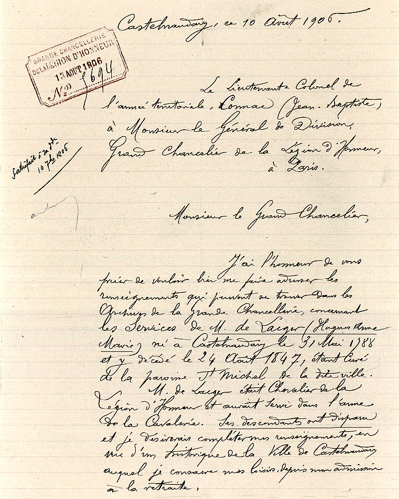 10 août 1906. Lettre du lieutenant colonel Jean Baptiste Connac à Monsieur le général de division grand chancelier de la Légion d'honneur. Cf. Base Léonore. Lacger de, Hugues Anne. Cote : LH/1422/51. Nº de notice : L1422051.