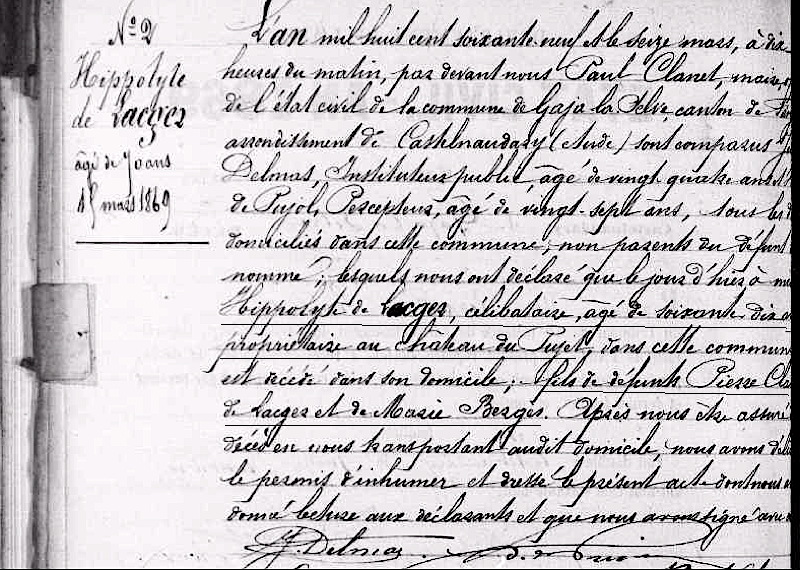 14 mars 1869. Décès d'Hippolyte de Lacger. Archives dép. de l'Aude. Gaja-la-Selve (1866-1875). 100NUM/5E159/13. Vue 76.