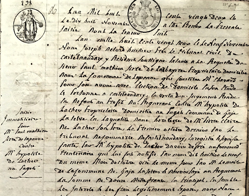 « Le 18 novembre 1822, nous Joseph Delort, huissier près le tribunal civil de Castelnaudary, à la demande du Sieur Paul Mathieu Sicre de Lasbaysses, propriétaire, domicilié dans la commune de Lapenne, qui constitue maître Chavard pour son avoué avec élection de domicile en son étude et personne à Castelnaudary, en vertu d'un jugement rendu par défaut au profit du requérant contre M. Hippolyte de Lacger, propriétaire, domicilié au Puget, commune de Gaja-la-Selve, en la qualité d'un héritier de Monsieur Pierre Claire de Lacger, son père, le premier octobre dernier le tribunal de commerce de Castelnaudary enregistré et signifié, faute par Hippolyte de Lacger d'avoir déféré au jugement trentenaire qui lui fut notifié par nousdit huissier le neuf du même mois d'octobre, visé le même jour par M. le maire de la commune de Gaja-la-Selve, et n'avoir payé au requérant la somme de douze mille francs en principal, ensemble les intérêts et les frais légitimement exposés, nous nous sommes aujourd'hui exprès transporté au domaine du Puget et successivement sur les biens et possessions en dépendant situés dans la commune de Gaja-la-Selve, canton de Fanjeaux, arrondissement de Castelnaudary, où, étant à sept heures du matin, avons en suivant le pouvoir à nous donné par requérant, saisi, mis sous la main du Roi et de la justice, ledit domaine du Puget et dépendances comme suit.