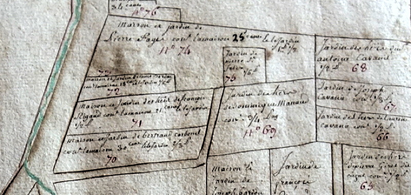 Ci-dessus : nº 52, jardin de François Rigaud ; nº 53, maison de François Bardou ; nº 54, maison de Paul Mervielle ; nº 55, maison d'Antoine Carbonel ; nº 56, maison des hers de François [illisible] ; nº 57, patu d'Antoine Carbonel ; nº 58, patu des hers de Jean Lauriol ; nº 59, maison de Jean Duran ; nº 60, patu, jardin entre Bertrand Bardou, hers de Dominique Manaud, et Joseph Bardou ; nº 61, jardin de Jean Duran ; nº 62, jardin des hers de François Dejean ; nº 63, jardin des hers de Dominique Manaud ; nº 64, jardin des hers de Dominique Manaud ; nº 65, jardin des hers de Pierre Giret. Ci-dessus : nº 65, jardin des hers de Pierre Giret ; nº 66, jardin des hers de Laurent Cabanié ; nº 67, jardin de Joseph Cabanié ; nº 68, jardin des hers d'Antoine Cabanié ; nº 69, jardin des hers de Dominique Manaud ; nº 70, maison et jardin de Bertrand Carbonel ; nº 71, maison et jardin des hers de François Rigaud ; nº 72, maison et jardin de Louis Bardou ; nºˢ 73 et 74, maison et jardin de Pierre Fage ; nº 75, jardin de Pierre Saint-Félix ; nº 76, maison de la communauté, servant de maison presbytérale. Ci-dessus : nº 5, pré du sieur Bernard Maudet ; nº 6, terre de Joseph Maris. Ci-dessus : nº 7, pré du seigneur. Ci-dessus : nº 74, maison et jardin de Pierre Fages ; nº 76, maison de la communauté, servant de maison presbytérale ; nº 77, grange, jardin de M. le curé de Portes. Ci-dessus : représentation naïvement simplifiée du cøur du village de Portes (plan 7). Quelques remarques