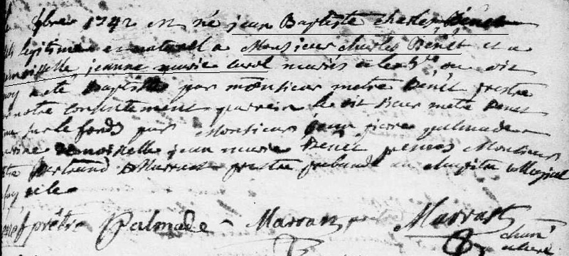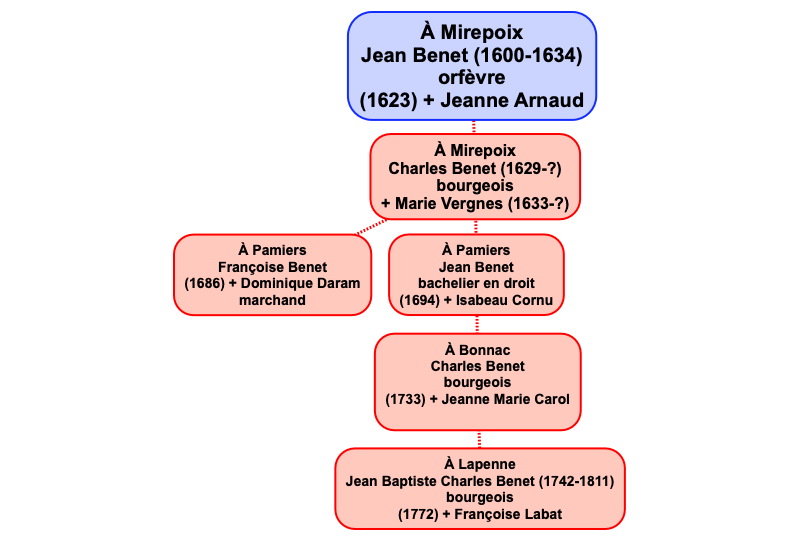 Né le [illisible] novembre 1742 à Pamiers, Jean Baptiste Charles Benet, fils de Charles Benet et de Jeanne Marie Carol, épouse le 18 février 1772 à Lapenne Françoise Labat, fille de feu François Labat forgeron, et de Marie Barthès. Il meurt, dit alors cultivateur, le 10 décembre 1811 à Lapenne.