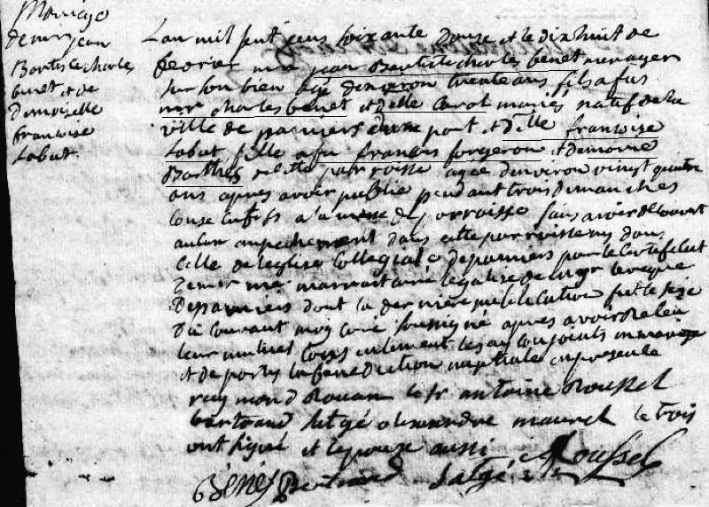 Daté du 16 juillet 1686, le contrat de mariage de Françoise Benet, fille de Charles Benet et de Marie Vergnes, indique le niveau de fortune auquel peut prétendre le jeune couple : « Contrat de mariage entre Dominique Daram, marchand de Pamiers, et Françoise Benet, fille de Charles Benet, bourgeois de Mirepoix, et de Marie Vergnes, portant : 1º constitution dotale pour la future de 2500 livres et d'une robe de soie ; 2º donation pour le futur des marchandises se trouvant dans la boutique de son père, évaluées 7000 livres, et d'une somme de 2000 livres ; 3° émancipation du futur par son père. Présents : Gabriel Marquessas, chanoine du chapitre cathédral de Rieux ; Noé Brun, archiprêtre de Latrape au diocèse même, etc. » (2).