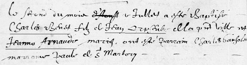 Ci-dessus : 2 juillet 1629. Baptême de Charles Benet. Archives dép. de l'Ariège. Mirepoix. Saint Maurice (1627-1639). Document 1NUM4/5MI662. Vue 20.
