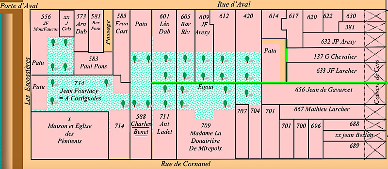 Cf. Archives dép. de l'Ariège. Compoix de 1666. Lot n° 588. Charles Benet, bourgeois, tient rue Courlanel maison à deux planchers, sotoul la moitié à la rue Daval et l'autre à la rue Courlanel ; y a un jardin et un patu. Plus lots 589 à 600. Le plan reproduit ci-dessus a été établi par Alain Marmion. Voir Relevés/Mirepoix. Compoix de 1666/Table des contribuables et plan terrier de la ville.