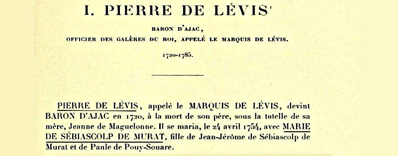 D'après l'Inventaire historique et généalogique des documents des branches latérales de la maison de Lévis, Pierre de Lévis (1), baron d'Ajac, épouse le 24 avril 1754 Marie de Sebiascolp de Murat, fille de Jean Jérôme Sebiascolp de Murat et de Paule de Pouy Souare. Ce nom de Sebiascolp ne dit rien à personne, et pour cause, car il ne se trouve mentionné ni dans le registre paroissial d'Ajac — l'année 1754 manque — ni nulle part ailleurs, sauf dans l'Histoire de la Bezole et de ses environs (Aude) (2) de Jacques Lemoine, sans autre précision, et dans l'Histoire et généalogie de la maison de Lévis (3) de Georges Martin, sans autre précision non plus, puisque tous deux tirent leur information du seul l'Inventaire historique et généalogique des documents des branches latérales de la maison de Lévis.