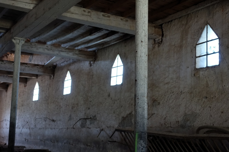 Ci-dessus : vues prises à l'intérieur du bâtiment industriel de la Mondonne. La lumière qui tombe des baies en demi-lune ou en triange produit dans le clair-obscur de la bâtisse un effet saisissant.