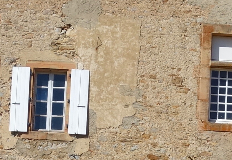 Ci-dessus : vestige de cadran solaire, ruiné par le percement d'une fenêtre avant l'arrivée de René Nelli. Ce cadran solaire portait jadis la devise de Gilbert de Saint-Jean de Moussolens, dont la famille, après celle de Voisins, a possédé la seigneurie de Bouisse et a vécu au château de Bouisse de 1650 à 1792.