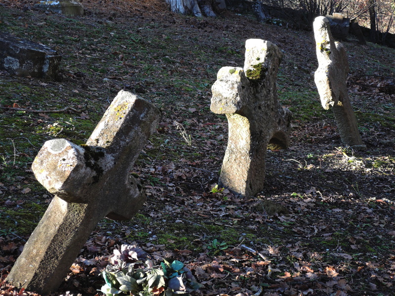 Ci-dessus : derrière l’église, dans le cimetière, emporté par la pente du ravin.