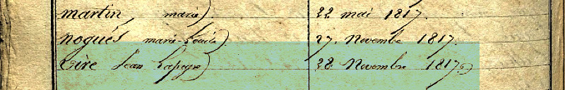 28 novembre 1817. Naissance de Vire Jean Lapeyre. Archives dép. des Hautes-Pyrénées. Castelbajac. Table décennale 1813-1822. Document 2 E 4/97. Vue 7. N.B. : Le registre d’état-civil correspondant n’est à ce jour pas numérisé.
