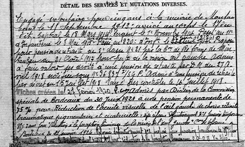 Réformé de façon définitive le 21 janvier 1924, Charles Vire-Lapeyre, né le 3 septembre 1895 à Bordeaux, fils de feu Jules Pierre Vire-Lapeyre et de Marie Amanda Boinard, enfant de troupe, engagé volontaire pour cinq ans le 15 septembre 1913 à la mairie de Montauban, caporal le 18 mars 1914, sergent le 1er novembre, blessé une première fois le 26 août 1914, une seconde fois le 16 mars 1917, se trouve proposé le 21 août 1917 pour une pension de retraite de 5e classe, au motif suivant : « perte de vision de son oeil gauche » et « défiguration ». Il est âgé alors de vingt-deux ans. Le 27 avril 1918, il est admis à faire valoir ses droits à la retraite. Le 30 juin 1921, la Commission spéciale de Bordeaux lui accorde une pension permanente de 75 %. Il obtiendra par la suite une pension définitive de 100 %.