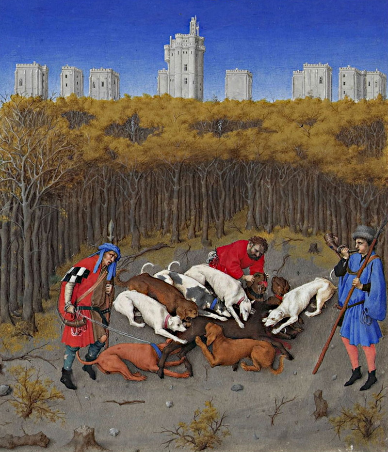 Décembre, in Les Très Riches Heures du duc de Berry, folio 12. En arrière-plan, le bois et le château de Vincennes, tel qu'en 1444. Philippe VI de Valois aime à séjourner dans son manoir de Vincennes plutôt qu'à Paris. Entre 1336 et 1340, soucieux de se prémunir des effets de la guerre qui vient, il fait établir les fondations d'un donjon à une centaine de mètres de son manoir. C'est ce donjon qu'on voit sur la miniature ci-dessus.