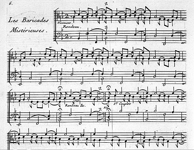François Couperin (1814–1875), Partition des Baricades mistérieuses (1716-1717), premières portées, International Music Score Library Project (IMSLP). Petrucci Music Library.